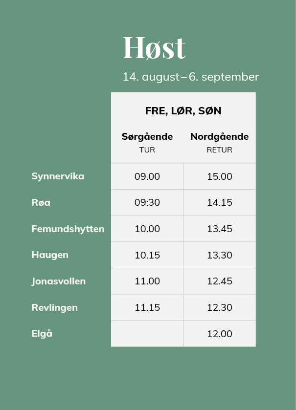ATBs bus route 540 corresponds to M/S Fæmund II on friday, Saturday and Sunday – not Monday, Tuesday Wednesday, Thursday. You will find more information HERE.