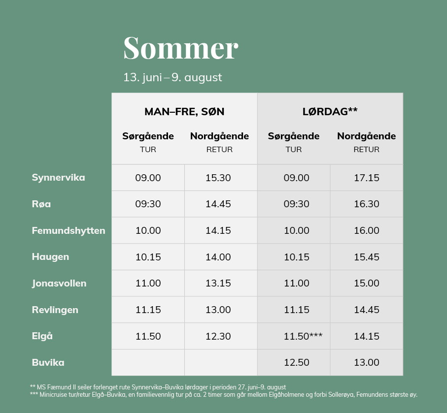 Summer route sailing Synnervika-Elgå MONDAY-FRIDAY AND SUNDAY 13th June to 9th August,